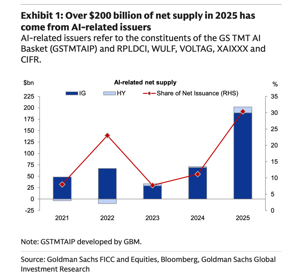The net new supply of AI-related debt from all tech companies doubled this year to $200 billion, according to research by Goldman Sachs, and now accounts for 30% of all corporate debt issuance.