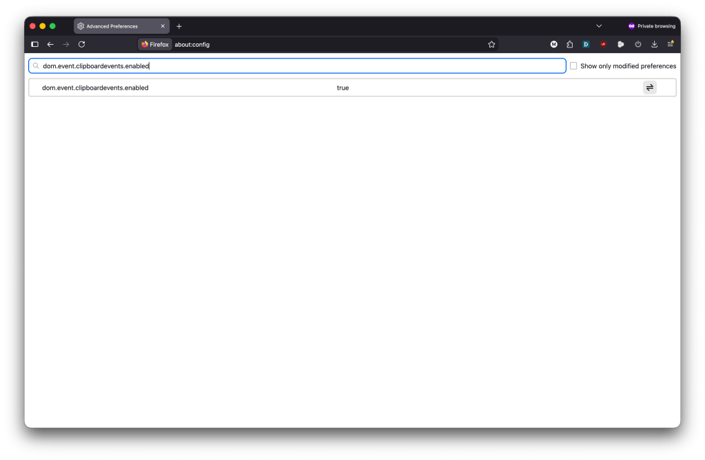 Rather than give up on Firefox or toggle between it and another browser every time you have to use Google Workspace, open a fresh tab in Firefox. Type “about:config” into the URL bar. It’ll show you a warning; click through it. You’ll be fine. Now, into the bar on the page that appears, type dom.event.clipboardevents.enabled