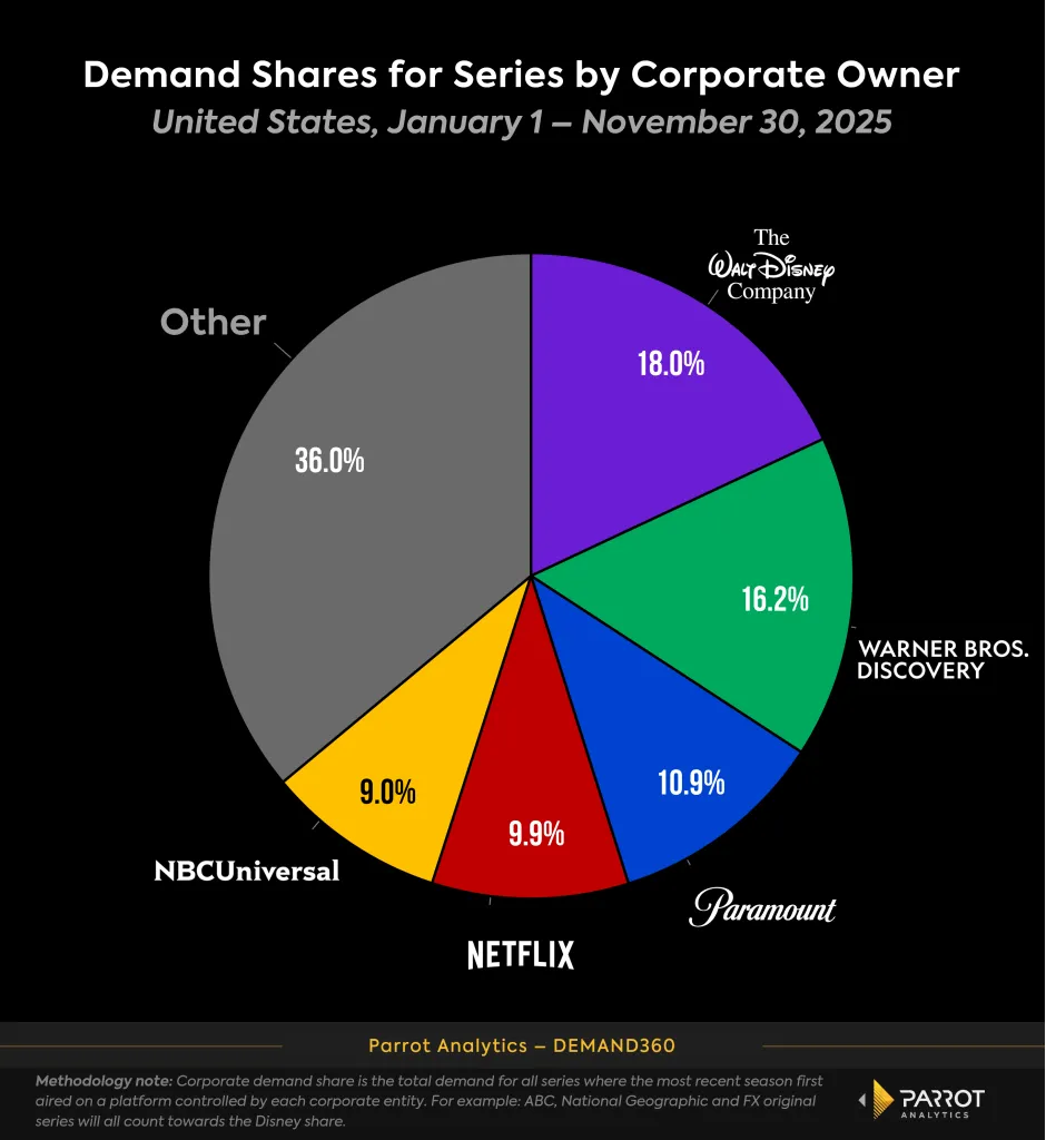 Parrot Analytics’ demand data at the corporate level underscores just how valuable WBD’s catalog remains in today’s attention economy. From January through November 2025, 16.2% of US demand for all TV series was for a title that falls under WBD’s corporate umbrella, second only to Disney’s 18%. The relative standing of the leading players in this metric has remained fairly stable since the WarnerMedia-Discovery merger. It is hard to drastically shake things up at the macro corporate level without M&A activity, but that is exactly what looks set to happen.