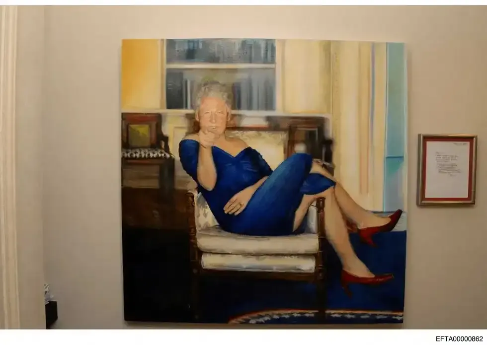 Images show a painting of Clinton in a dress, Clinton in a pool with two women — one of whom appears to be Ghislaine Maxwell — a woman sitting on the former president’s lap inside a plane, an interaction between Clinton and Epstein in matching shirts, pop stars Michael Jackson and Diana Ross, along with an image of Clinton in a jacuzzi and some type of meeting with a number of other people.